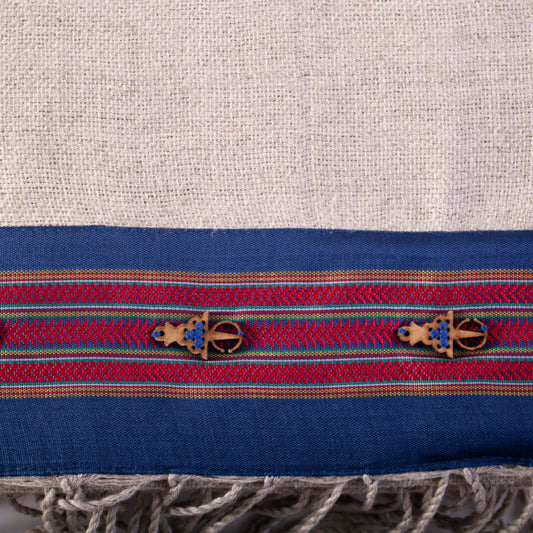 Hand-embroidered "Hayek" scarf in wool and linen - Beige and blue